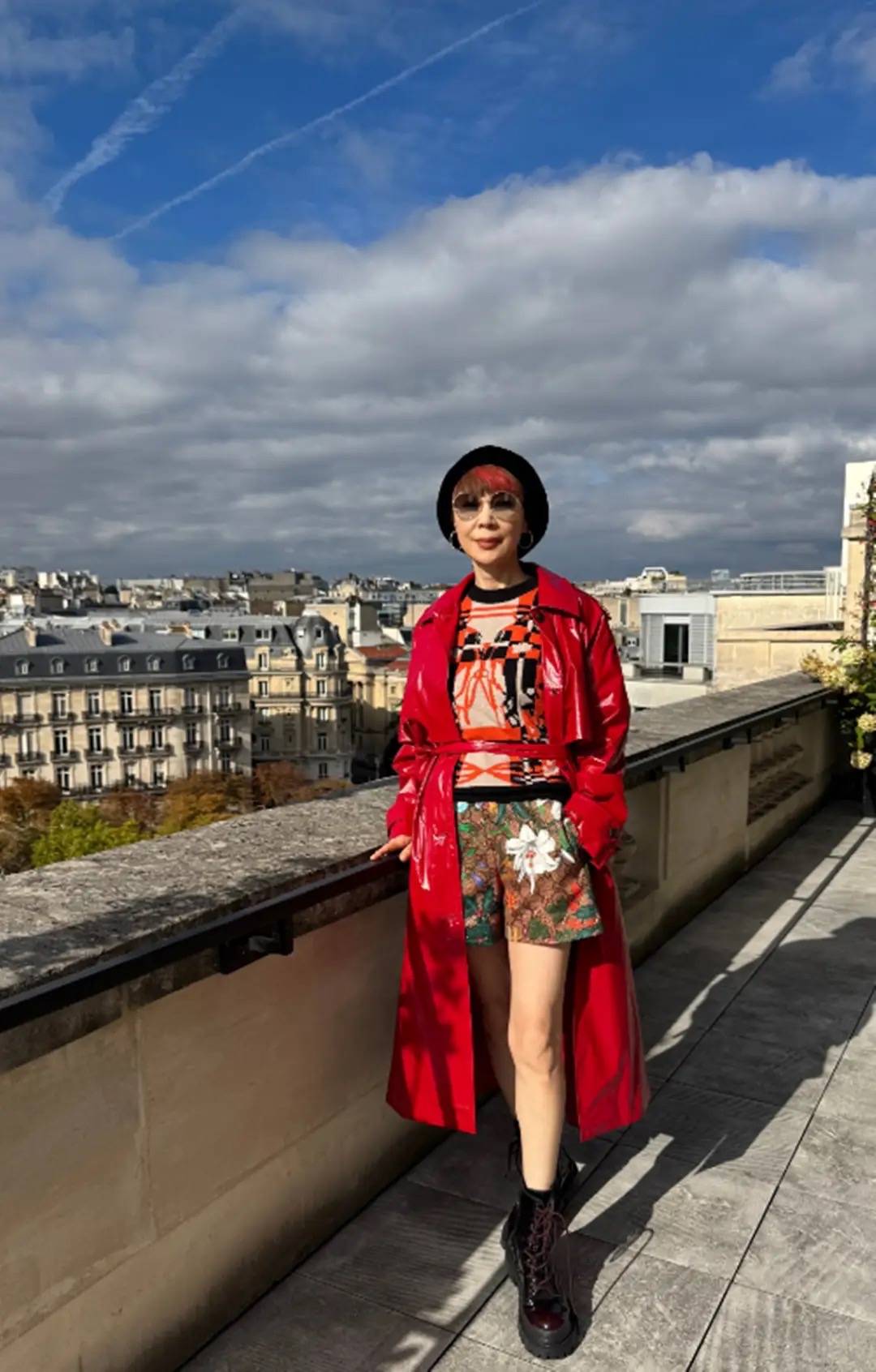 穿着一件LV的外套、配修身的黑色T恤、黑色直筒裤,整个人显得很有精神、也特别干练。高挑笔直的身板,显得年轻了许多。